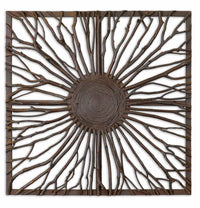 This Decorative Wall Art Features Real Wooden Branches With Burnished Edges And Light Gray Accents Woven Onto A Wooden Frame.