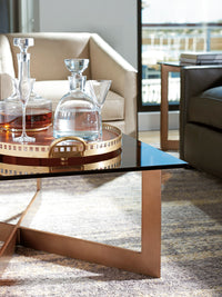The contemporary asymmetrical metal base offers an interesting focal point for your gathering area. The inset tempered glass top is amber tinted to highlight the bronze finished silver leaf base. A coordinating Aperture end table is also available.