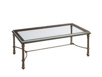 The Bluff rectangular cocktail table features a decorative metal base in a textured brass finish and a .75-inch ultra-clear glass top with a polished flat edge. The lay-on glass top is inset an inch from the perimeter of the table for visual interest.