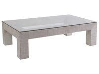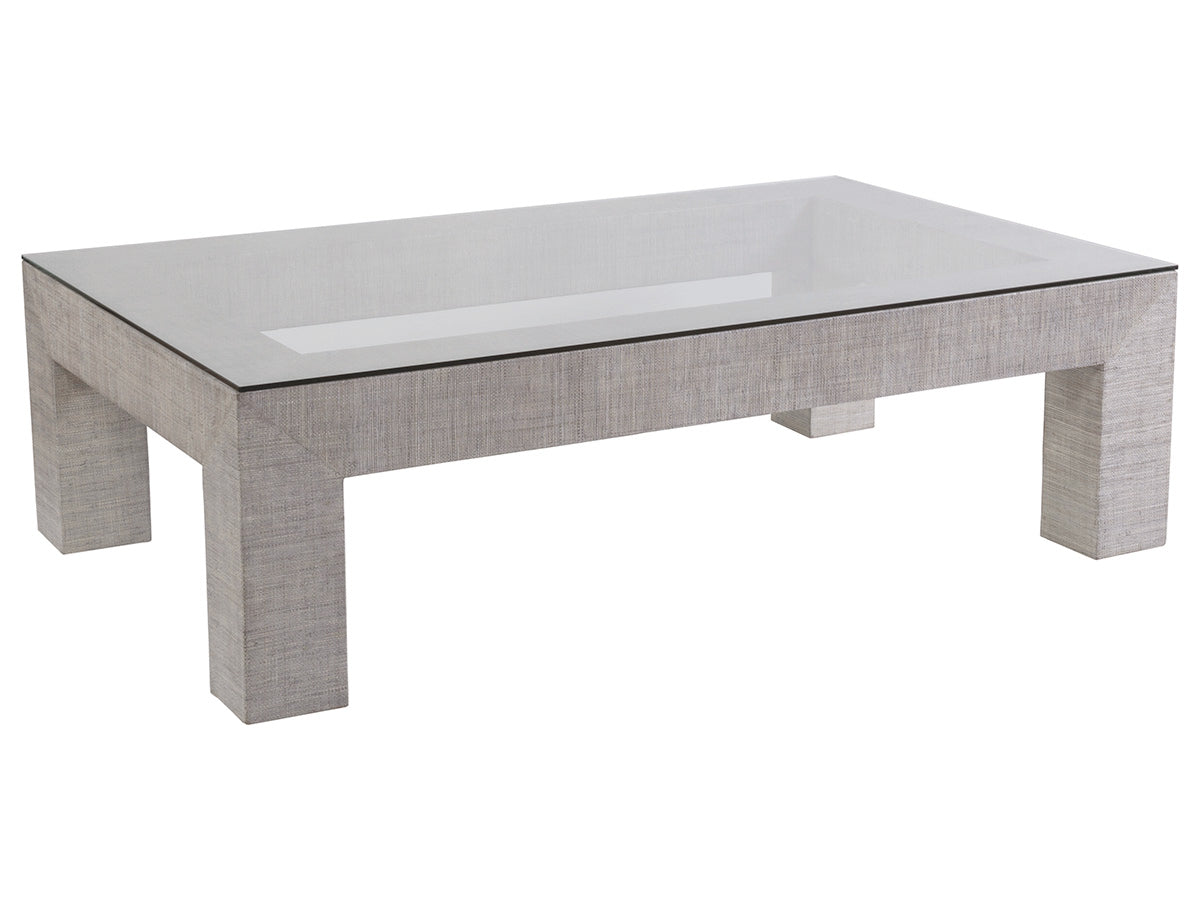 Veneered raffia base with mitered corners in a light gray coloration and a tempered glass top with flat polished edge.