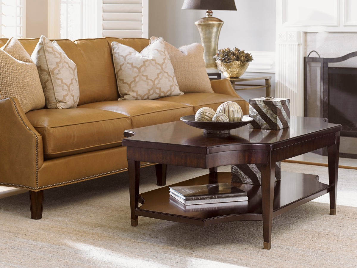 Ribbon Stripe Mahogany veneer top with elegant black ebony inlay features scalloped corners and a shelf below. Antique brass finished ferrules add unique detail to this sophisticated design.