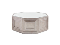 Featuring beveled step-down panels on each of the eight sides, the design showcases the hand-applied silver leaf finish with surface interest. The inset beveled mirror top surface adds a reflective sparkle to the room.