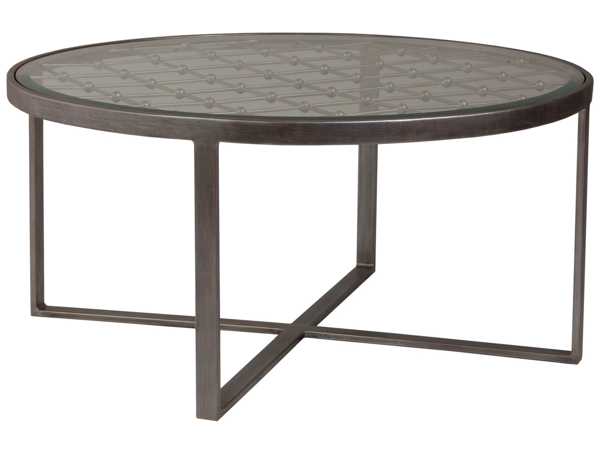Classic transitional, vintage croisillon patterned base, crafted from hand-forged iron with an inset, one-inch beveled glass top. Available as shown in the Antique Copper finish, dark antiqued tones with directional hand graining.