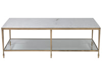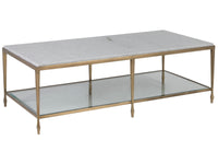 Light, airy designs in solid iron finished in antiqued gold leaf. The six-legged traditional form features a quartz-like Grano de Sal marble top and tempered glass shelf.