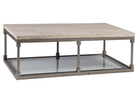 Transitional design in antiqued silver leaf finished iron base and tempered glass inset shelf with 1-inch bevel.
