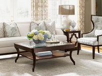 The beveled glass insert framed with Ribbon Stripe Mahogany veneer sits above elegant saber legs and wooden shelf with black ebony inlay details.