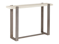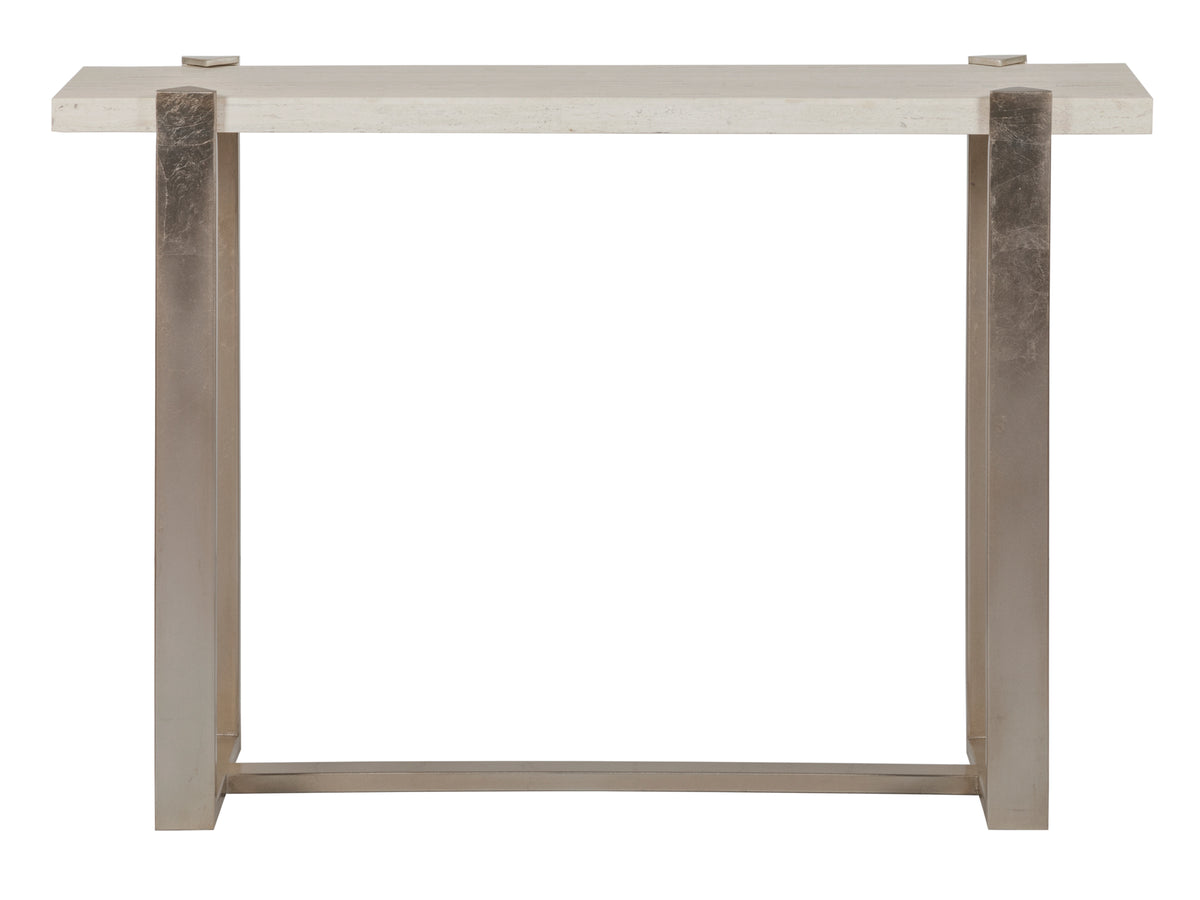Versatile contemporary console table featuring a honed White Vein travertine top standing on an iron base in a champagne silver leaf finish.