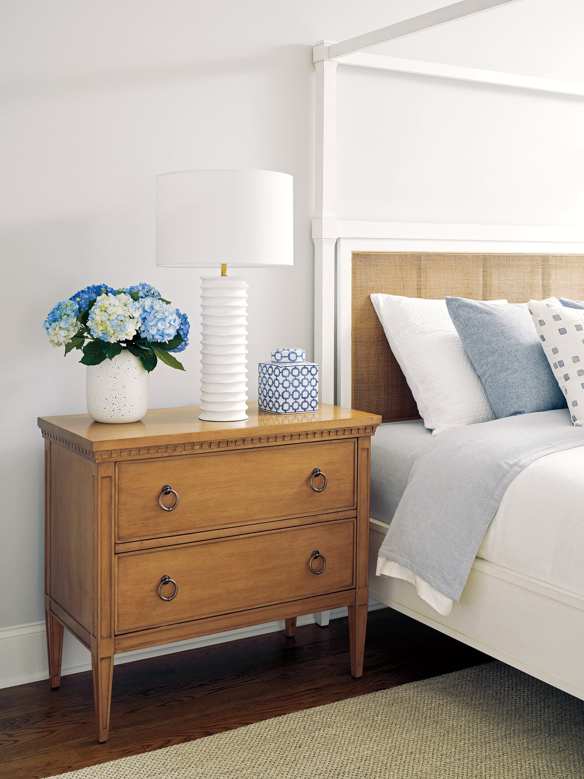 The Dartmoor bachelor’s chest is designed for spacious master suites. The design features dentil molding around the top, two large soft-close drawers, tapered legs, and custom pendent hardware.