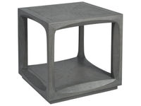 The top and bottom shelf are crafted from flat-cut veneers in a starburst pattern, with legs and rails routed in a continuous ellipse, in a medium gray wire-brushed finish.
