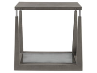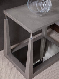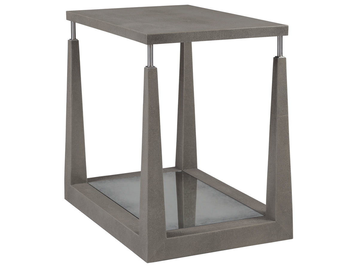 Crafted from faux Shagreen in a warm gray finish with antique mirror deck, four reverse tapered legs, and polished stainless steel accents.