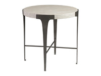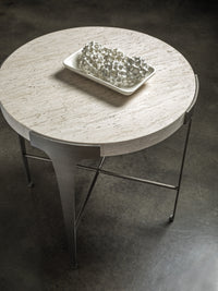 Laser-cut steel base in a ribbed silver leaf finish with a White Vein inset travertine top resting on saber shaped legs with decorative stretcher.