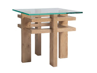 The end table features a contemporary Asian-inspired design with strong horizontal lines complemented by an ultra-clear lay-on glass top. A correlating cocktail table design is also available.