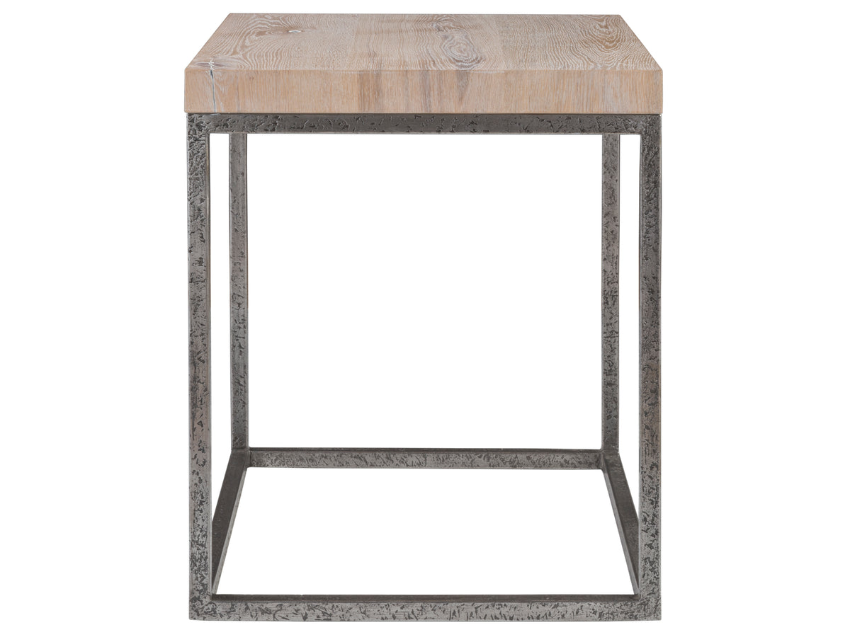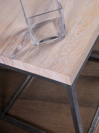 Contemporary design featuring a thick, heavily distressed Barnyard oak veneer top in random planks on an open, heavily distressed iron base. The surface is a natural waxed finish.