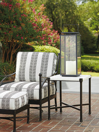 Pavlova occasional tables feature clean architectural lines with a cross-stretcher at the base and contemporary flared legs. Frames have a sophisticated, lightly textured graphic finish, and durable all-weather tops emulate the look and feel of honed natural limestone, in a soft ivory coloration, for a classic look.