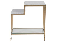 Light, airy designs in solid iron finished in antiqued gold leaf. The stepped end table features two quartz-like Grano de Sal marble tops and a lower tempered glass shelf.