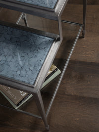 Light, airy designs in solid iron finished in antiqued silver leaf. The stepped end table has a top and shelf featuring Eglomise glass painted by individual artists in a soft grey evoking pooled water. The bottom shelf is a tempered clear glass.