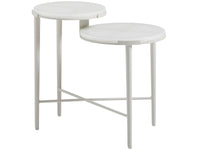 The unique design of the tiered end table is comprised of two overlapping pieces. Artistic white glass tops, with swirly tone-on-tone patterns in the glass adds a contemporary flair.