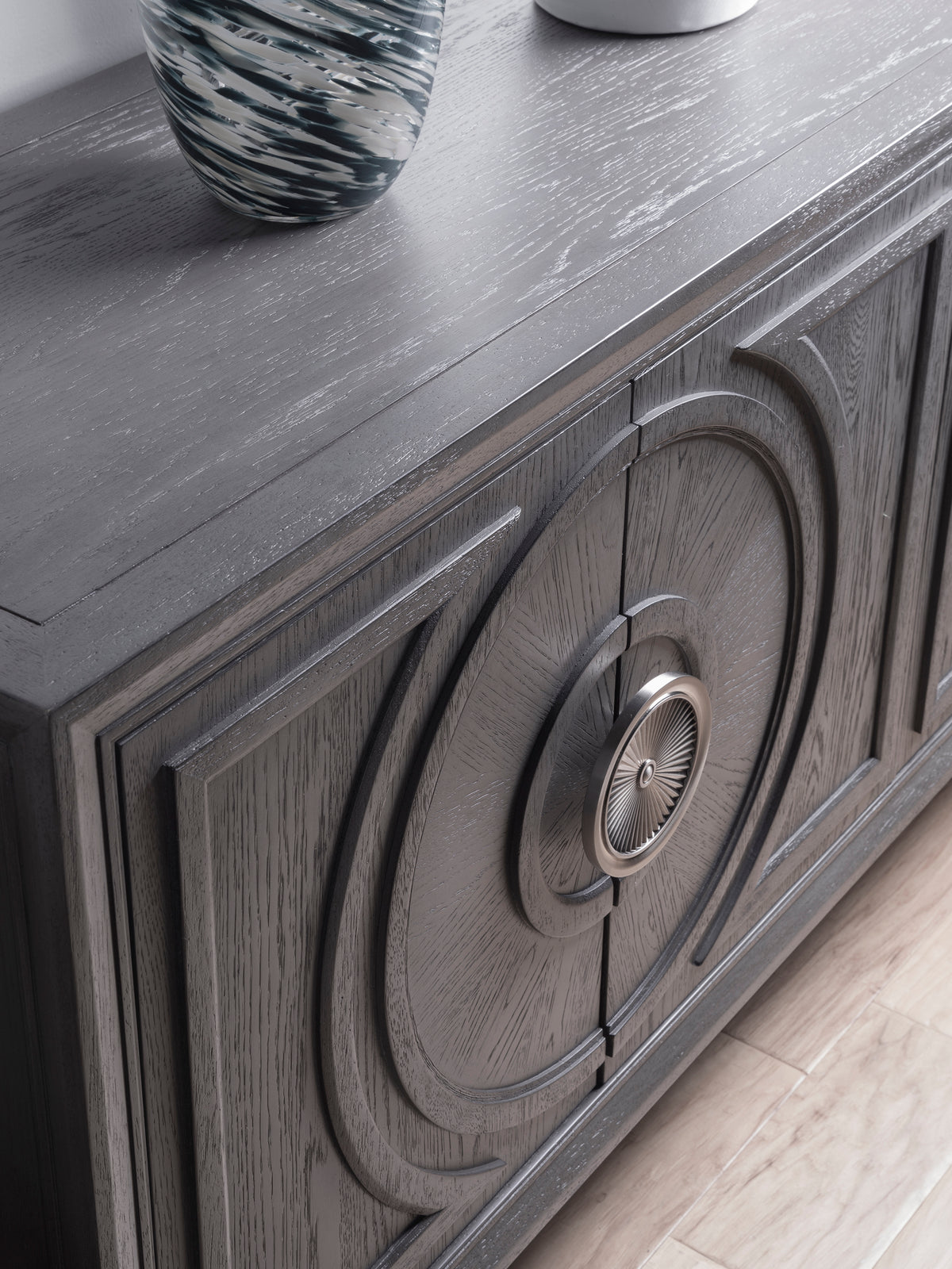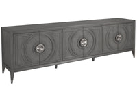 Crafted from flat-cut white oak veneers and select hardwoods in a medium gray wirebrushed finish, with overscaled brushed nickel finished custom hardware. The six doors open to an adjustable shelf and drawer behind each pair, and a ventilated removable back panel for media components.