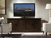 The 78-inch Corbett media console is scaled to accommodate every possible media component behind four White Ash Burl doors. There are three large adjustable shelves behind each pair of doors. The back panel is ventilated with grommets for wire management. The top features Cherry veneer with an ebony black inlay around the perimeter.