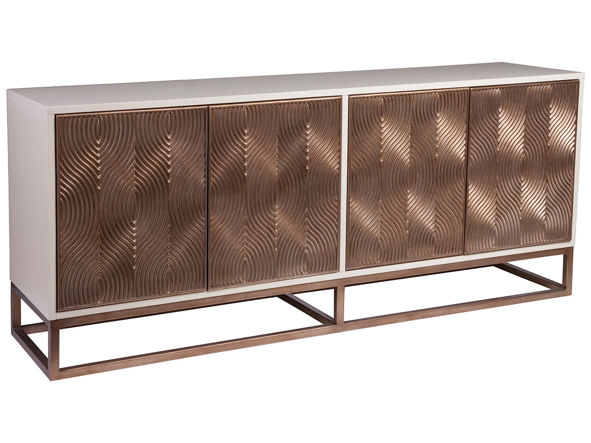 The patterned casted door fronts create a moiré effect, lending a glamorous iridescence to any setting. The console features four adjustable shelves behind the four soft-close hinged doors with touch latch hardware. The painted ivory matte and lacquered case sits on an iron base in a warm silver leaf finish. A ventilated back allows air flow for electronics.