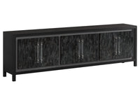 Faux horn motif hand-painted by artists on individual resin tiles in a dark gray bone coloration with custom acrylic hardware and bright nickel finished clasps located on the six doors which hide six adjustable shelves and a ventilated back.