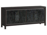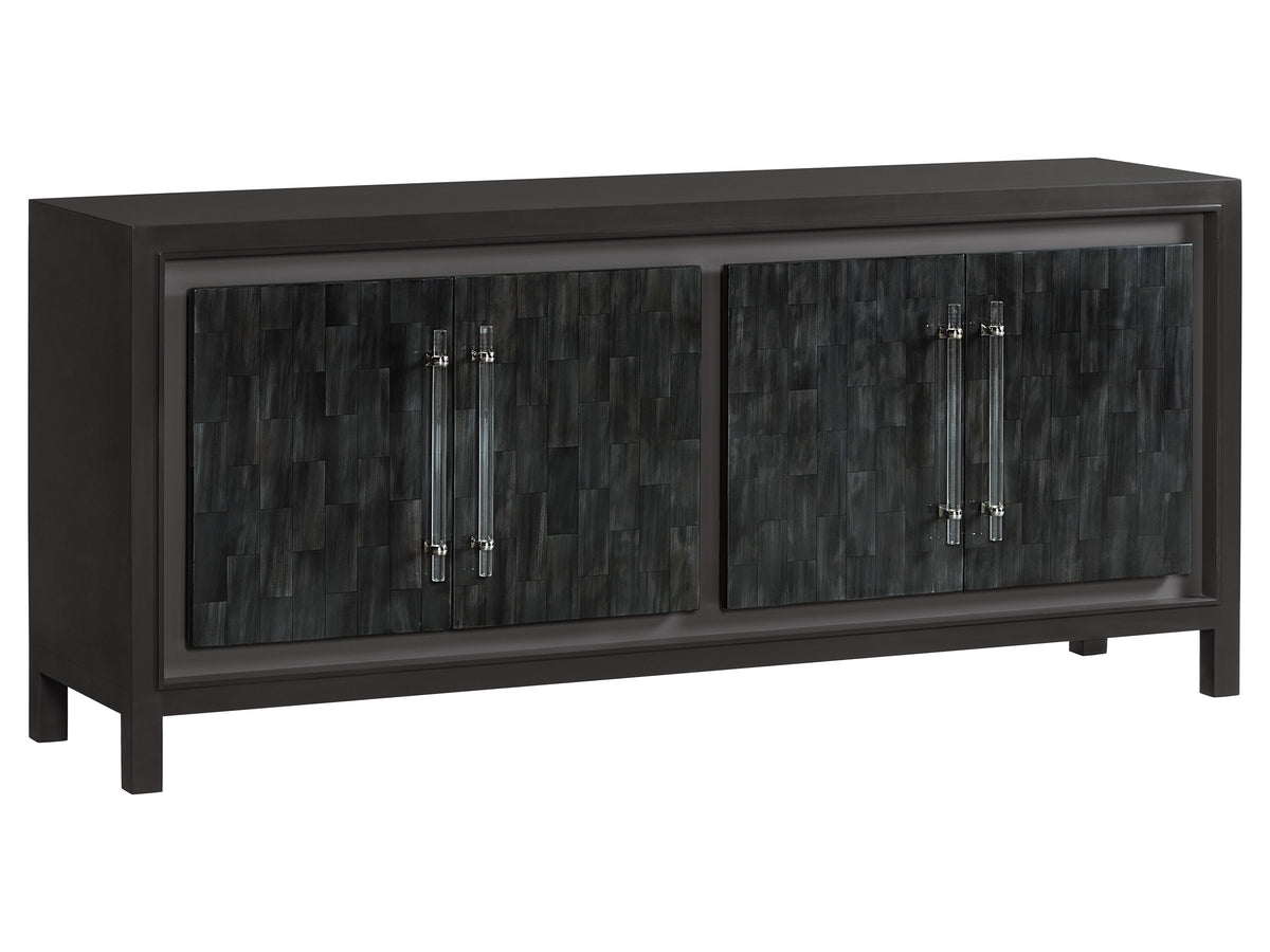 Faux horn motif hand-painted by artists on individual resin tiles in a dark gray bone coloration with custom acrylic hardware and bright nickel finished clasps located on the four doors which hide four adjustable shelves and a ventilated back.