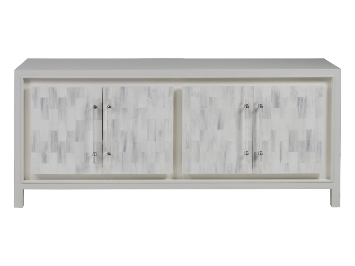 Faux horn motif hand-painted by artists on individual resin tiles in a light gray/white bone coloration with custom acrylic hardware and bright nickel finished clasps located on the four doors which hide four adjustable shelves and a ventilated back.