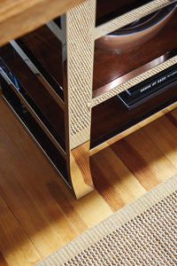 This media console features a polished stainless base, inset Walnut shelves in eight separate compartments and a solid Trembesi live-edge top. The Trembesi tree, indigenous to islands in the South Pacific, has the look and characteristics of Black Walnut. Its natural live-edge offers a striking juxtaposition to the contemporary stainless base, giving the piece a unique designer look. The size and shape of natural tops will vary. The piece has grommets for electrical cords.