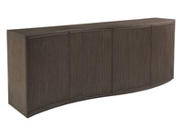 Original modern design featuring an asymmetrical curved footprint dressed with fluted doors in a medium cappuccino gray oak finish on sandblasted quartered white oak. The sculptured body is reminiscent of an ocean wave. Four reeded doors with touch latch hardware (out doors with 110 degree stop), four adjustable shelves, and ventilated sliding back.