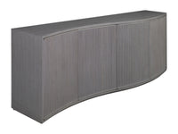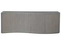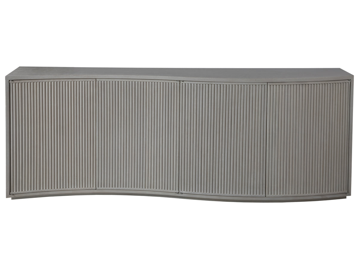 Original modern design featuring an asymmetrical curved footprint dressed with fluted doors in a misty white gray finish on sandblasted quartered white oak. Sculptured body reminiscent of an ocean wave. Four reeded doors with touch latch hardware (outer doors with 110 degree stop), four adjustable shelves, and ventilated sliding back panel.