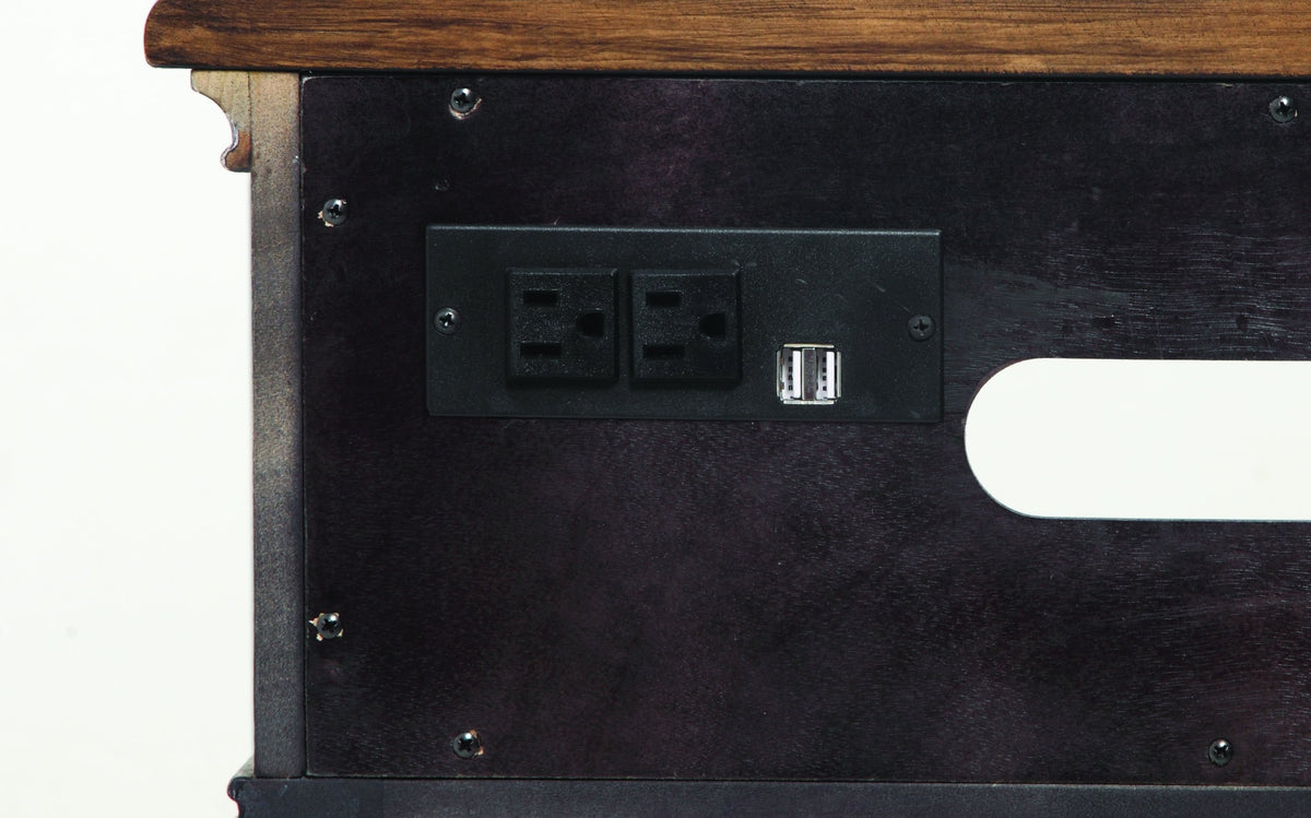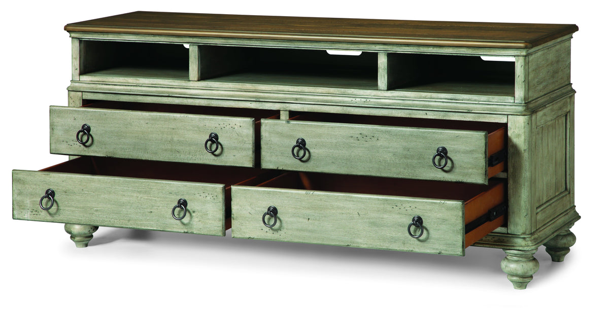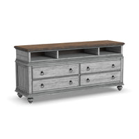 Add cottage-inspired charm to the spaces where you watch your favorite shows with the Plymouth entertainment base. Featuring four drawers with premium ball-bearing glides and three open compartments with cable access, this spacious entertainment base provides ample room for storing electronics, media and gaming accessories. A planked top creates the ideal surface for your TV, while two built-in electrical outlets and USB ports add convenience for keeping devices powered. With a weathered graywash finish, antique gunmetal pulls and turned bun feet, this base brings a warm vintage look to living spaces and family rooms.