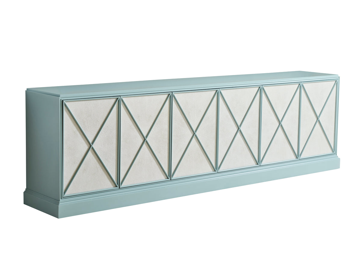 Transitional design crafted from select hardwoods in a soft pale blue finish. Six touch latched doors with contrasting faux shagreen fronts and decorative diamond fretwork, nine adjustable shelves, ventilated backs, and plinth base.