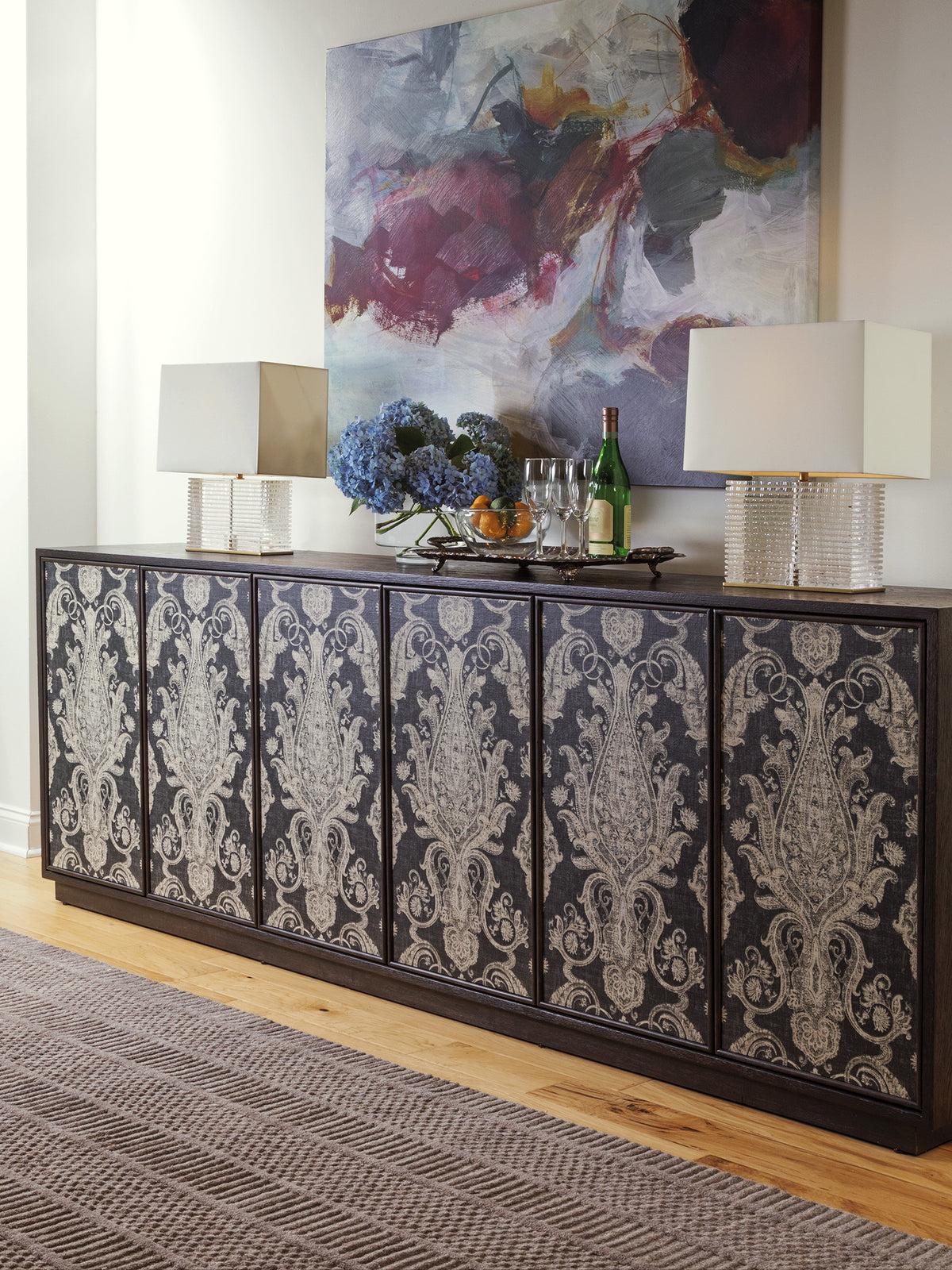 Contemporary design crafted from select hardwoods and flat-cut oak veneers in a heavily sandblasted rich mocha brown coloration with a satin sheen. Features six wood framed fabric covered doors, six adjustable shelves, a ventilated back, and a recessed plinth base.