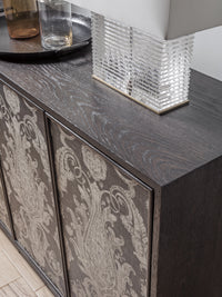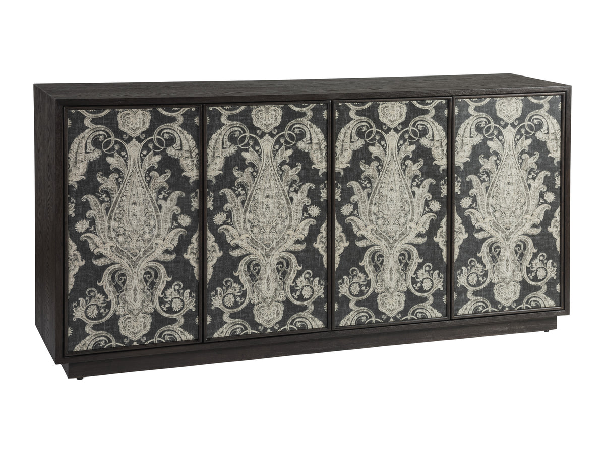 Contemporary design crafted from select hardwoods and flat-cut oak veneers in a heavily sandblasted rich mocha brown coloration with a satin sheen. Features four wood framed fabric covered doors, four adjustable shelves, a ventilated back, and a recessed plinth base.