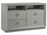 Beautifully proportioned case with architectural lines and repeated chamfered moldings. The surface is lacquered performance fabric emulating linen with brushed nickel hardware. There are four Zeitgeist silhouettes designed to either stand alone or be grouped together in dramatic wall configurations, with the depth differential creating a breakfront effect. The media console includes four full-extension self closing drawers below two open caompartments with ventilated backs and removable back panels for components. The open compartments are 24.5W x 6.25H each.
