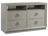 Beautifully proportioned case with architectural lines and repeated chamfered moldings, all dressed in white oak wire brushed ceruse.There are four Zeitgeist silhouettes designed to either stand alone or be grouped together in dramatic wall configurations, with the depth differential creating a breakfront effect. The media console includes four full-extension self closing drawers below two open caompartments with ventilated backs and removable back panels for components. The open compartments are 24.5W x 6.25H each. Quartered white oak veneers and solids are finished in the white and gray wire brushed ceruse finish.