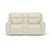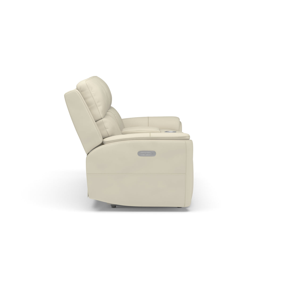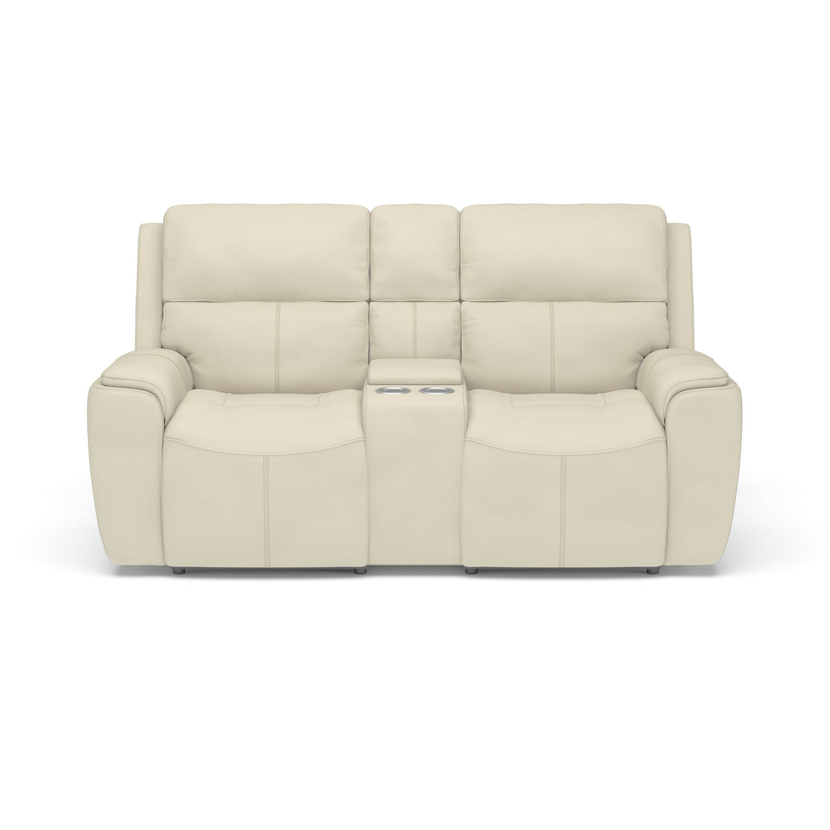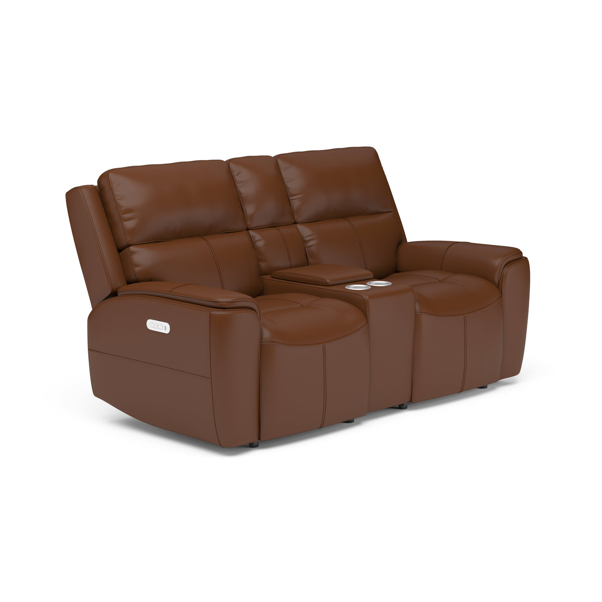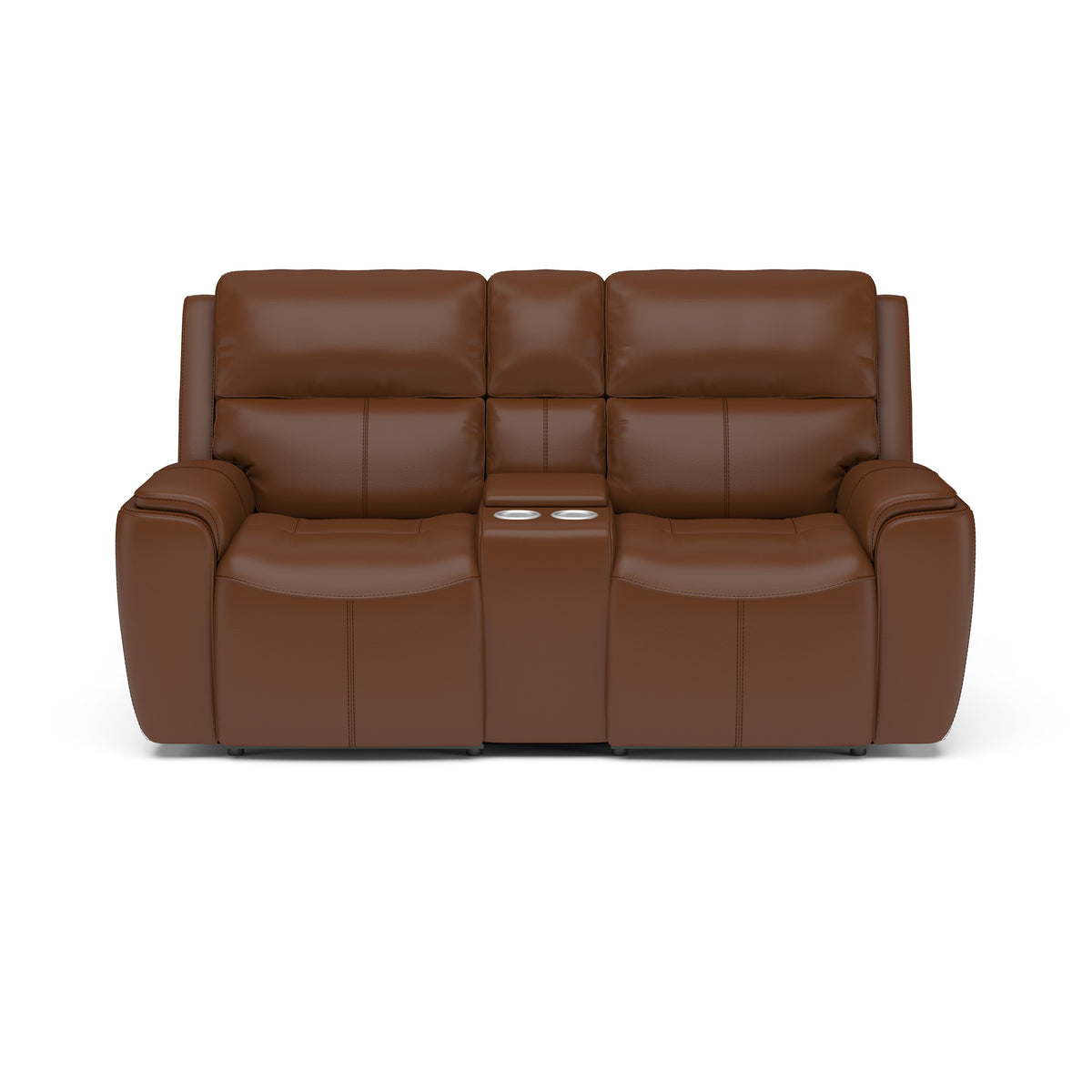 Whether you’re having a movie marathon or watching the big game, you can keep the essentials for a fun night close at hand with the Ellis Power Reclining Loveseat with Console and Power Headrests. The loveseat’s convenient storage console with beverage holders offers plenty of space to house remotes and personal items. Both people sitting can personalize their experience with easy-to-access power controls that independently adjust the recline and headrests. With convenient USB charging ports built into the controls, you won’t have to worry about keeping devices powered up. Enjoy the luxury of a contoured seat with waterfall chaise, which is bolstered by our patented Flexsteel DualFlex Spring System™ that offers a mix of firmness and flexibility as you sit. Thoughtful enhancements, including divided back cushions with kidney support, shell track arms and durable heavy-thread top-stitching, provide comfort with an elevated look. And with two color options of our premium leather upholstery, you can choose a design that will enhance your décor.