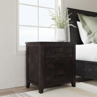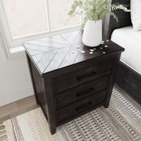 Inviting character meets modern convenience with the Chevron nightstand. Three roomy soft-close drawers, accented by pulls in a gunmetal finish, store all your bedside essentials. This nightstand also features integrated power and USB ports to keep devices charged and unsightly cords concealed. A striking chevron patterned top and gently tapered legs create a casual yet sophisticated look. Finished in a rich ebony color, this nightstand adds character and visual interest to bedrooms.