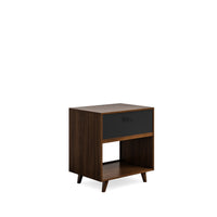 Mid-century styling meets modern convenience with this elegant nightstand designed to store your bedside essentials. Outfitted with a roomy, felt-lined top drawer and an open lower shelf, the Ludwig open nightstand also features integrated power to keep unsightly cords neatly concealed. A warm walnut finish accented with brushed brass drawer pulls lends timeless sophistication. Splayed, tapered legs and chamfered frame edges create an iconic silhouette on this nightstand.