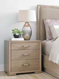 The nightstand features three drawers for ample storage. Rich shades of taupe and gray highlight the soft horizontal grain lines of the Gray Elm veneers. Custom hardware blends a wood pull bar anchored by metal end caps in an aged silver finish.