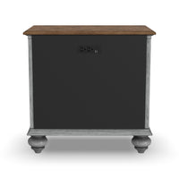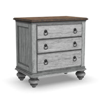 Vintage cottage style meets modern convenience with the Plymouth nightstand. Outfitted with three roomy drawers on premium ball-bearing glides to store all your bedside essentials, this nightstand also features integrated power to keep unsightly cords concealed and USB ports to charge your devices. A distressed graywash finish is contrasted with antique gunmetal pulls, while paneled accents and turned bun feet add to the unique vintage charm.