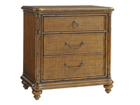 This nightstand features three drawers with woven raffia fronts, carved bamboo posts with leather wrapped pencil rattan accents and classic bun feet. It is one of three nightstands in the collection and is 32-inch wide.