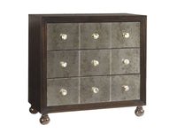 The three antiqued mirrored drawer fronts reflect the beauty of custom drawer pulls that are hand-crafted from black-lipped abalone shell.