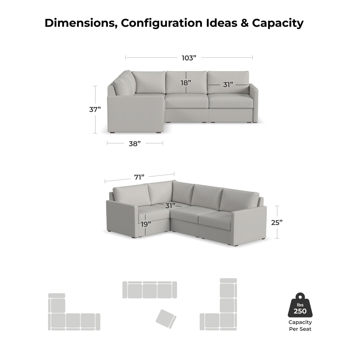 Designed for a lifetime of flexibility, the Flex 4-seat sectional supports the space you have now and can easily expand when your home does. Modular components allow a multitude of configurations so you can create the perfect seating arrangement. Built with Blue Steel Spring technology and sustainable, stain-resistant performance fabric, Flex seating provides deep-seated, blissful comfort and long-lasting livability. And assembly is a breeze with a patented J-bracket “no-tool” method that takes minutes, rather than hours.