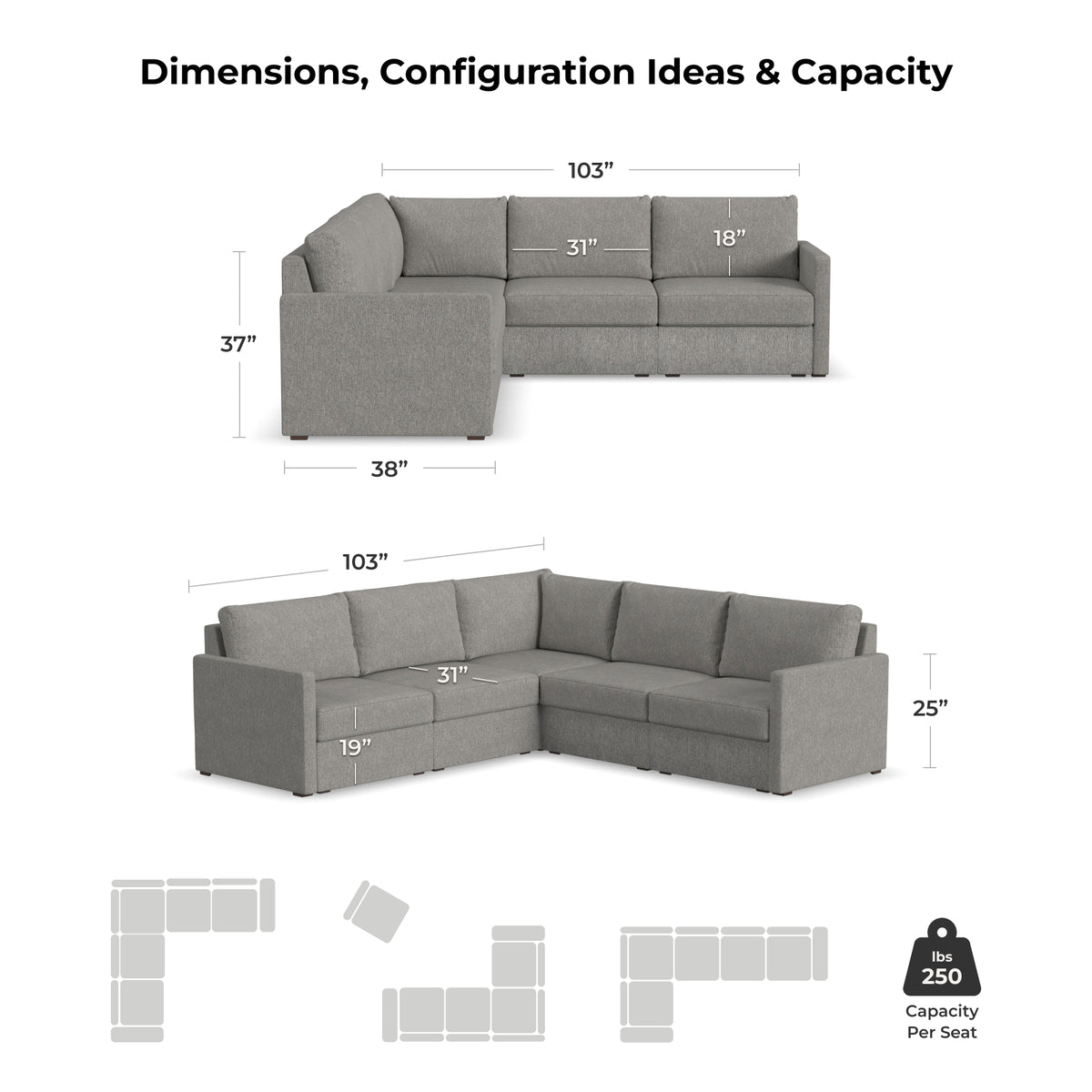 Designed for a lifetime of flexibility, the Flex 5-seat sectional supports the space you have now and can easily expand when your home does. Modular components allow a multitude of configurations so you can create the perfect seating arrangement. Built with Blue Steel Spring technology and sustainable, stain-resistant performance fabric, Flex seating provides deep-seated, blissful comfort and long-lasting livability. And assembly is a breeze with a patented J-bracket “no-tool” method that takes minutes, rather than hours.