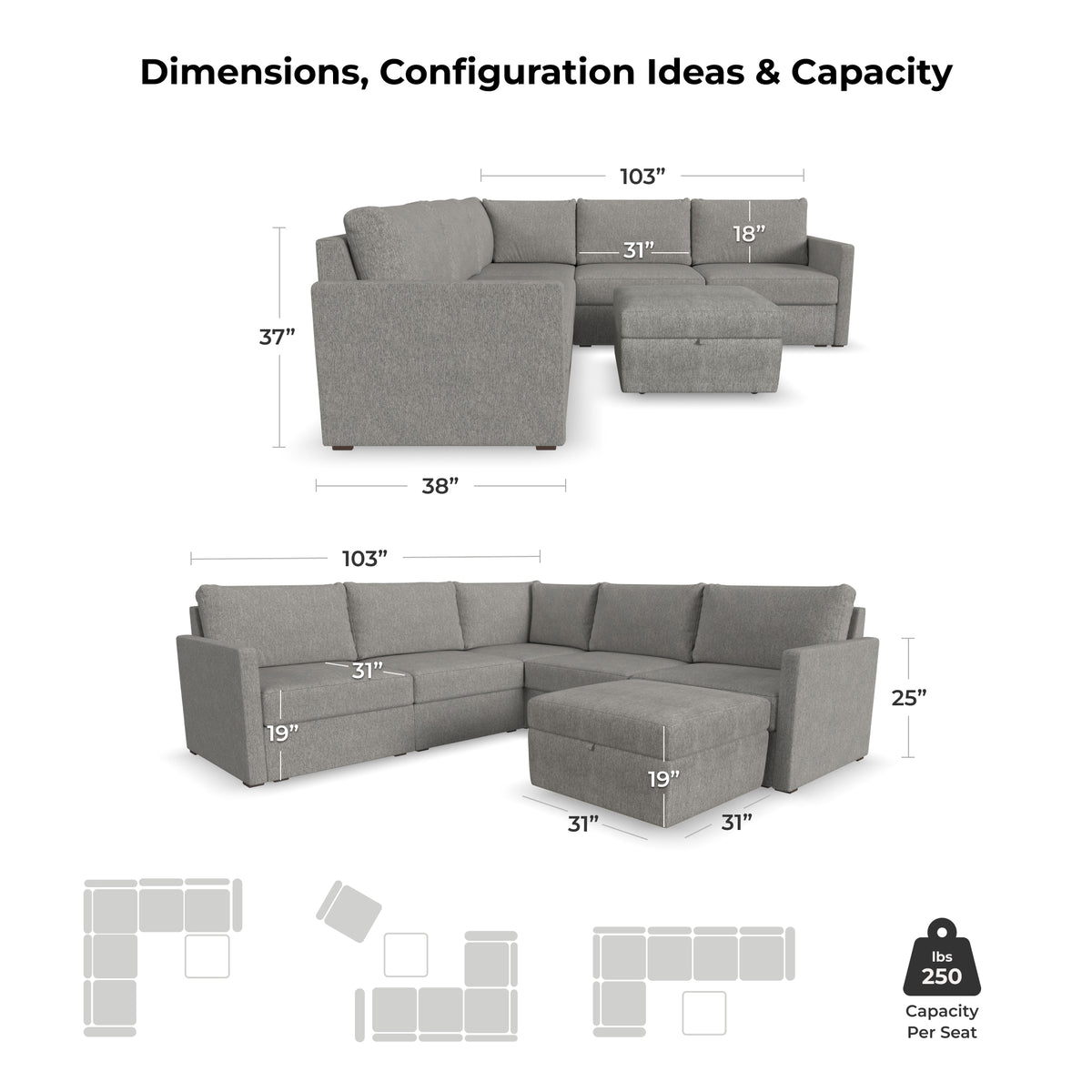 Designed for a lifetime of flexibility, the Flex 5-seat sectional with storage ottoman can easily contract or expand as your needs change. Use the ottoman as a standalone piece or combine with other the other modular components to create the perfect seating configuration for your space. Built with Blue Steel Spring technology and sustainable, stain-resistant performance fabric, Flex seating provides deep-seated, blissful comfort and long-lasting livability. And assembly is a breeze with a patented J-bracket “no-tool” method that takes minutes, rather than hours.