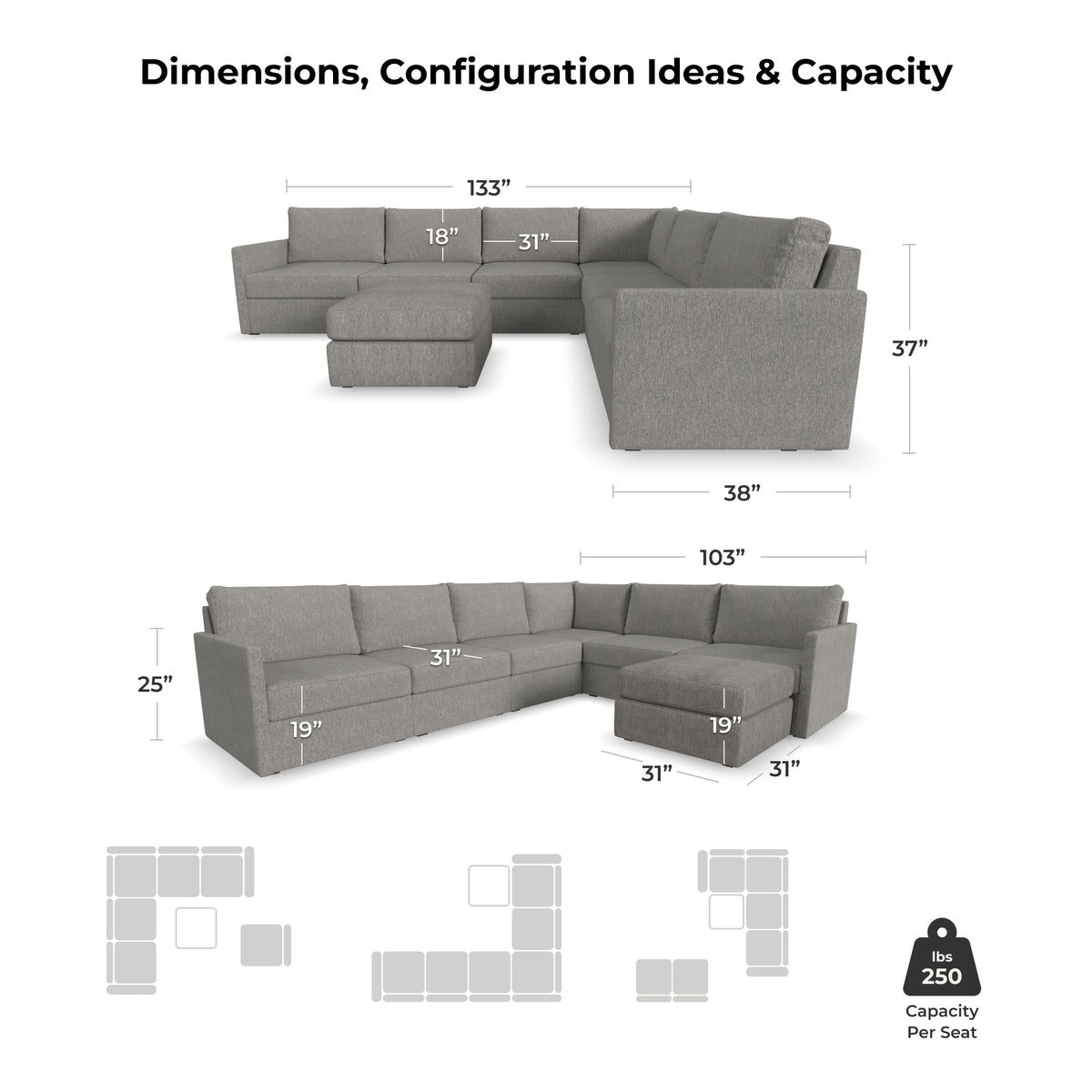 Designed for a lifetime of flexibility, the Flex 6-seat sectional with ottoman delivers reconfigurable relaxation for small and large groups. Use the ottoman as a standalone piece or combine with other the other modular components to create the perfect seating arrangement for your space. Built with Blue Steel Spring technology and sustainable, stain-resistant performance fabric, Flex seating provides deep-seated, blissful comfort and long-lasting livability. And assembly is a breeze with a patented J-bracket “no-tool” method that takes minutes, rather than hours.