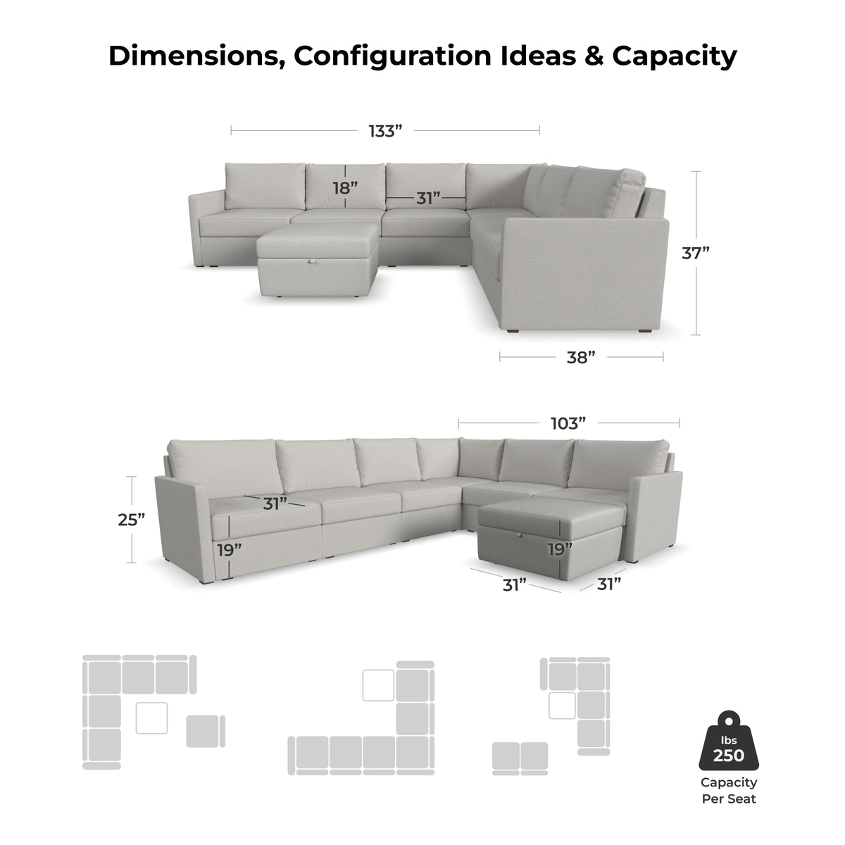Designed for a lifetime of flexibility, the Flex 6-seat sectional with storage ottoman delivers reconfigurable relaxation for small and large groups. Use the ottoman as a standalone piece or combine with other the other modular components to create the perfect seating arrangement for your space. Built with Blue Steel Spring technology and sustainable, stain-resistant performance fabric, Flex seating provides deep-seated, blissful comfort and long-lasting livability. And assembly is a breeze with a patented J-bracket “no-tool” method that takes minutes, rather than hours.