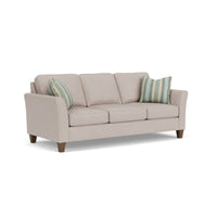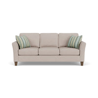 Libby is a transitional stationary style with clean lines and graceful curves. Its off-the-floor frame is complimented by square tapered legs. This sofa features an elegant roll arm with a detailed welt trim. Two square accent throw pillows are provided. The posh and plush style of Libby fits in with many home décor spaces.