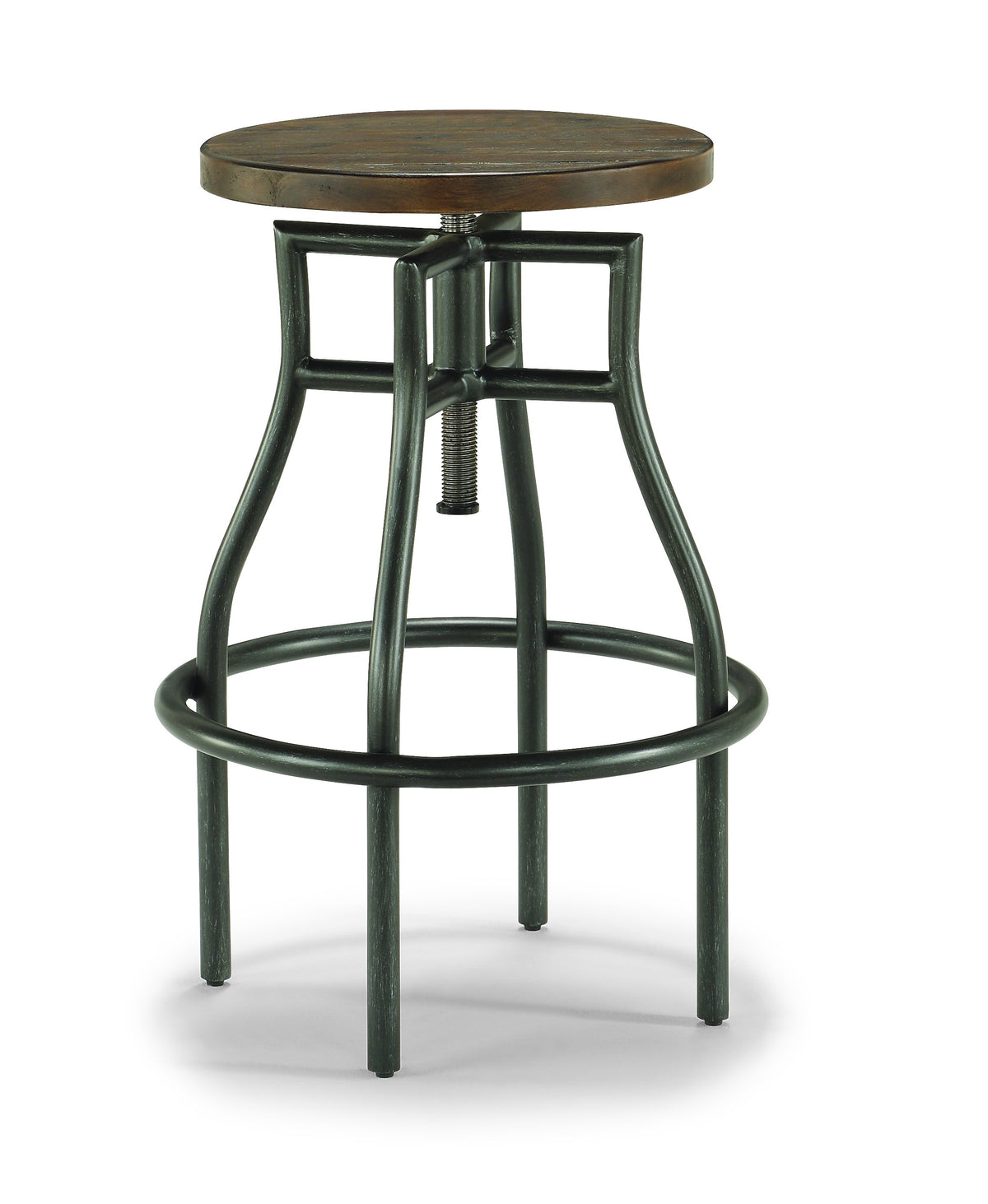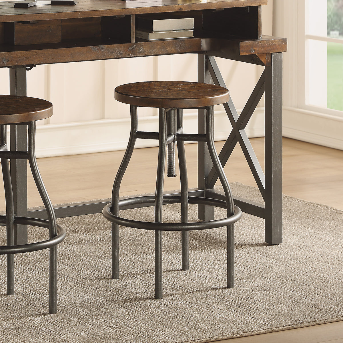 Add counter or bar height seating anywhere in your home with the height-adjustable Carpenter stool, which combines modern rustic style with industrial-inspired character. Height-adjustable for easy personalization, this stool also features a circular footrest so you can comfortably rest your feet, no matter what direction you’re facing. A dark brown, planked acacia wood seat sits upon metal legs that are treated to resemble aged, oiled steel. This timeless design makes the perfect addition to any kitchen or game room, or pair it with the Carpenter work console for a coordinated look.